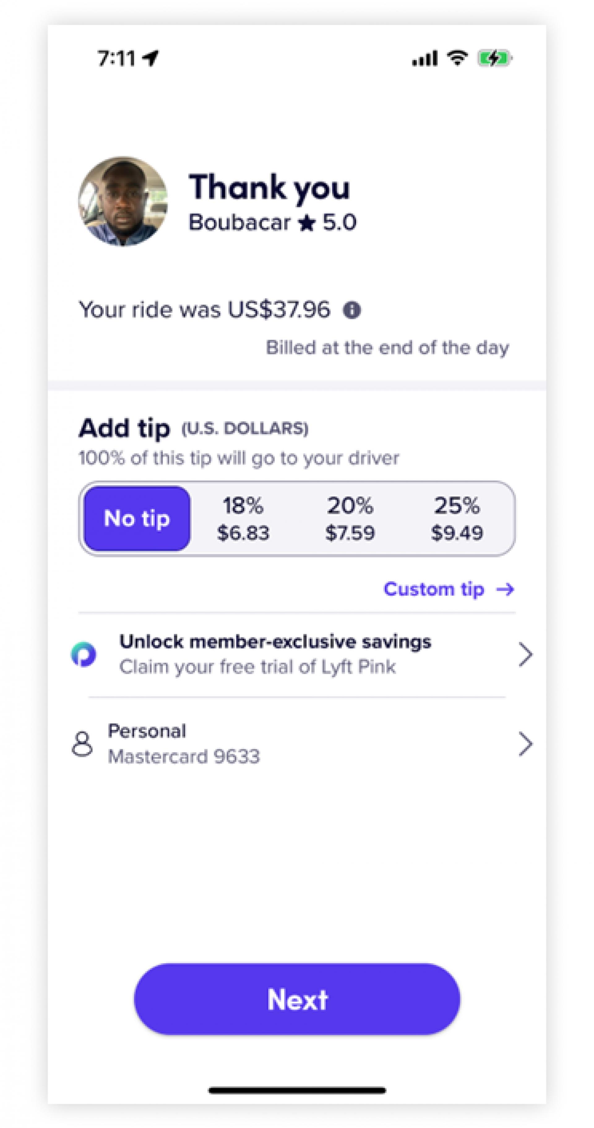Uber는 고객이 운전자에게 팁을 추가하는 기능을 만들었습니다. 현재는 아래 그림처럼 드라이버 평가하는 화면의 아래에 팁을 줄 수 있도록 했습니다.