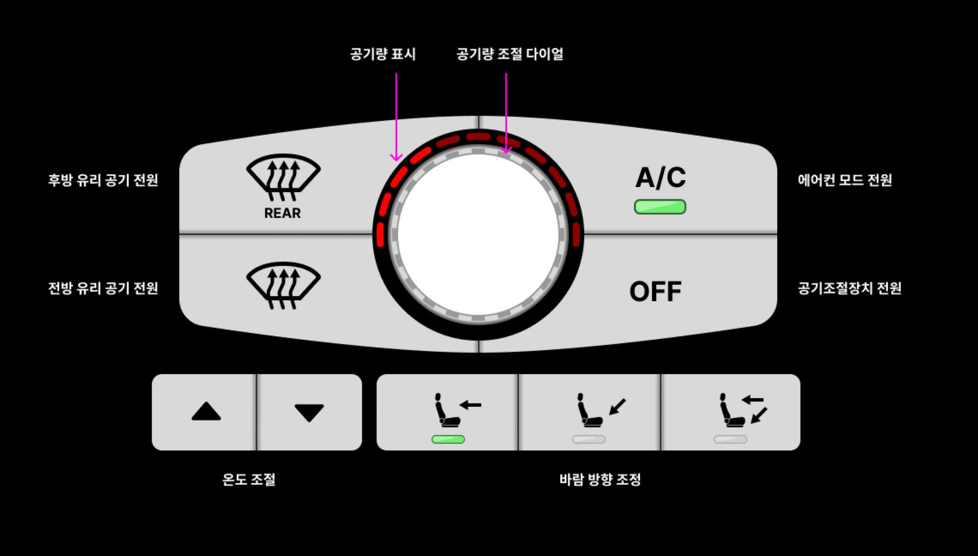 다음 이미지는 자동차 센터페시아 영역에 공기조절 장치의 인터페이스 중 일부입니다.가운데 원형으로 표시된 것은 회전 다이얼이고, 다이얼을 조정하여 풍량을 조정할 수 있습니다.