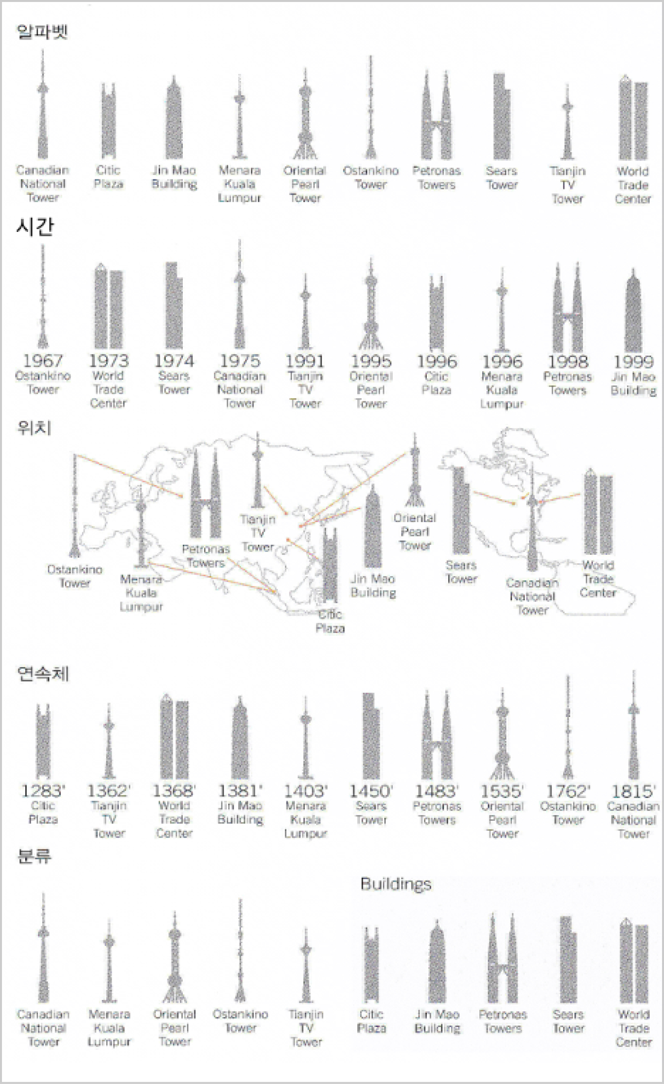 그러한 기준으로는 건물의 이름 기준 (알파벳), 건축물 양식 기준 (분류), 완공 연도 기준 (시간), 건물의 위치 기준 (위치), 건물의 높이 기준 (연속체)이 있습니다. (뒷장 그림 참고) 이 다섯 가지는 사용자가 정보/데이터를 탐색할 때 활용하는 기준이기도 하여 전화번호부, 일정, 사진앨범 등 정보/데이터를 보여주는 다양한 앱 UI에서 정보탐색 효율성을 향상시키는데 활용될 수 있습니다. 다섯 모자 걸이를 활용해 보세요. - 본인이 사용 중인 스마트폰의 사진앨범 UI가 다섯 모자 걸이 기준 각각에 어떻게 부합하는지 해석해 보고, 부족한 기준을 채울 수 있는 UI를 디자인해 보세요.