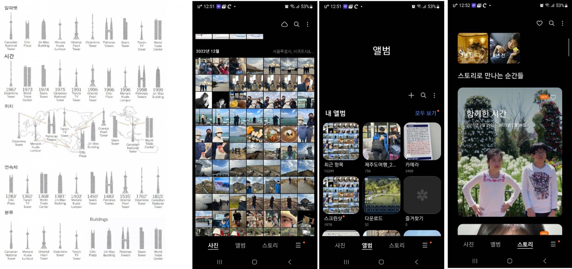 다섯 모자 걸이 (알파벳, 분류, 시간, 위치, 연속체) 기준을 이용하여 현재 스마트폰의 사진앨범 UI를 해석하고 개선안을 제안해 보세요. 아래 오른쪽 그림은 갤럭시 S22의 사진앨범 이미지 예시입니다. 본인이 사용 중인 스마트폰 사진앨범을 기준으로 아래 작업을 수행해 보세요.
