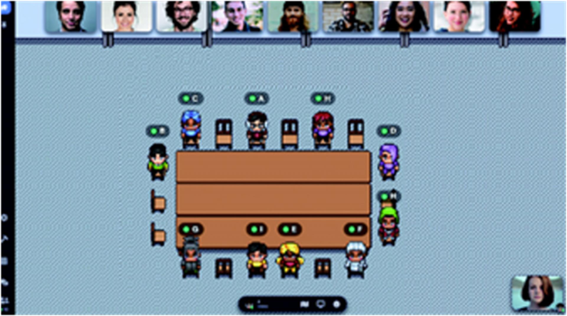 아래는 대표적인 메타버스인 게더타운의 사용 이미지 중 하나입니다.참여한 사용자들의 아바타들은 테이블 주위에, 해당 사용자(아바타)의 화상 화면은 위쪽에 참여한 순서대로 일렬로 나열됩니다. 따라서, 아바타와 해당 화상이 매핑이 되지 않는 문제가 있습니다.