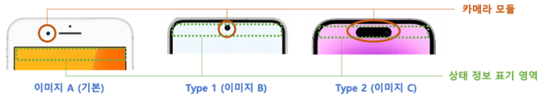 스마트폰의 카메라 기술이 발전하고 폰의 물리적인 크기를 늘리지 않고도 화면(Display)의 크기를 늘리기 위해서 카메라 모듈이 화면의 영역에 포함되는 것이 일반화되고 있습니다.카메라 영역으로 인해 폰 화면 상단의 상태 정보들은 새롭게 디자인될 필요가 있습니다.
