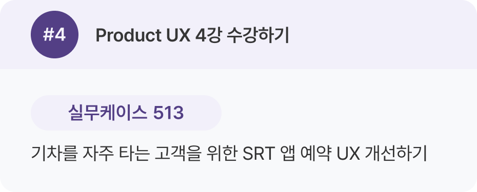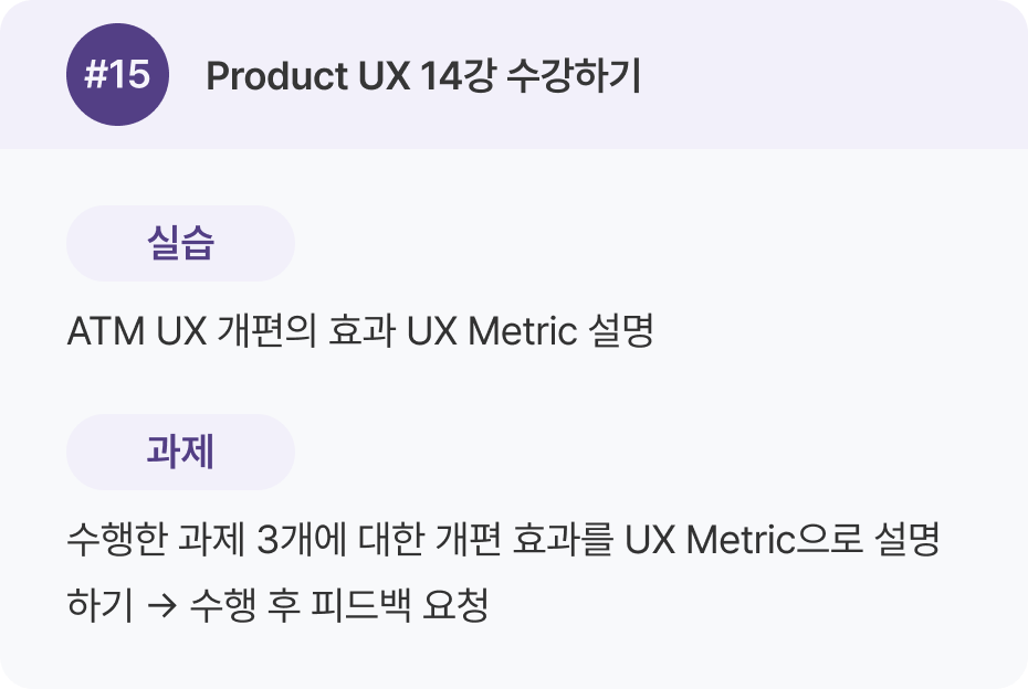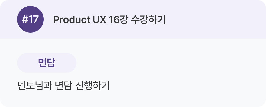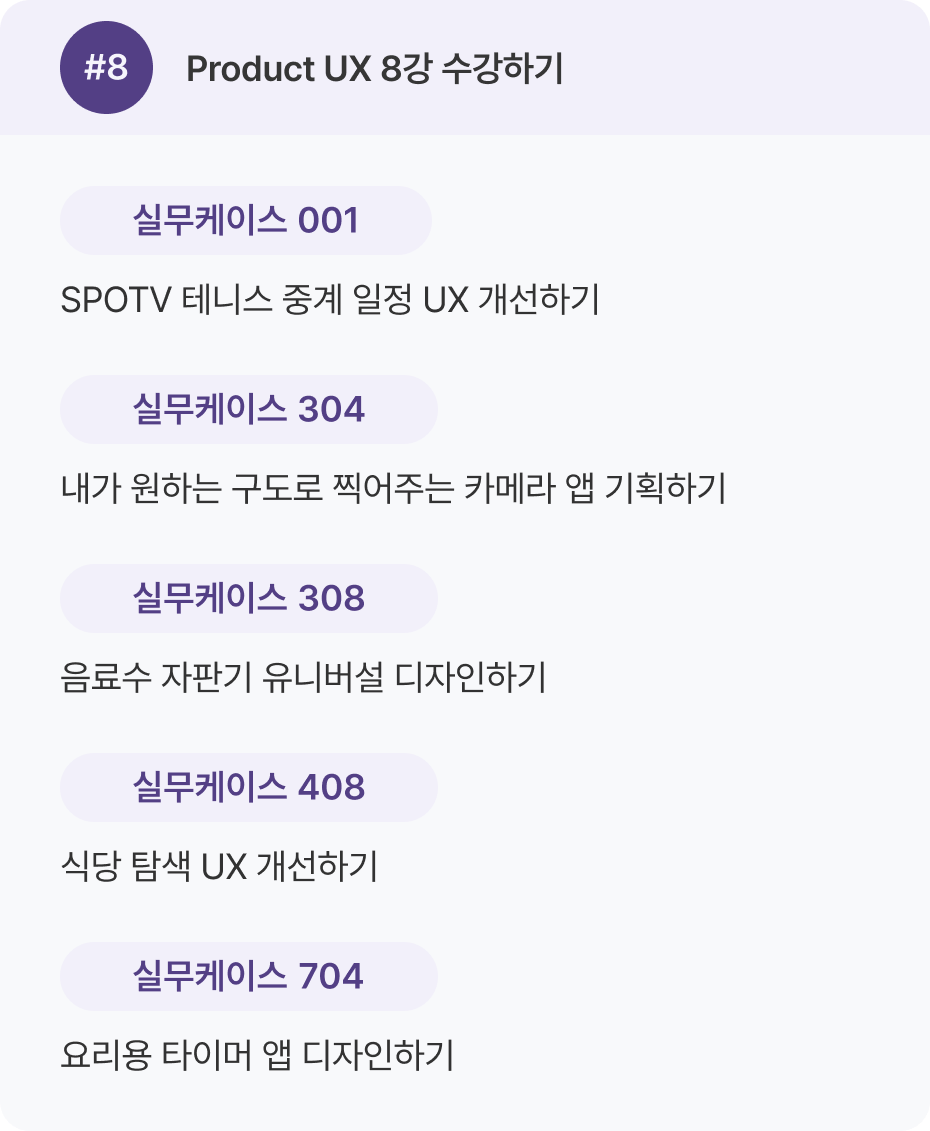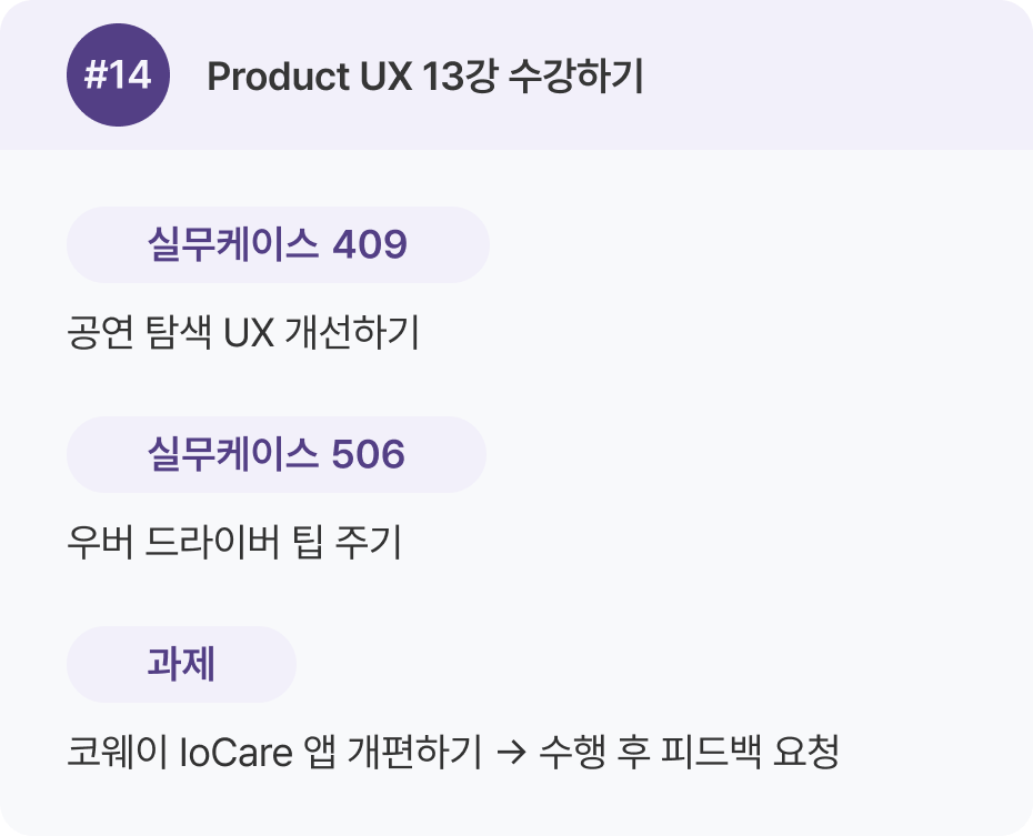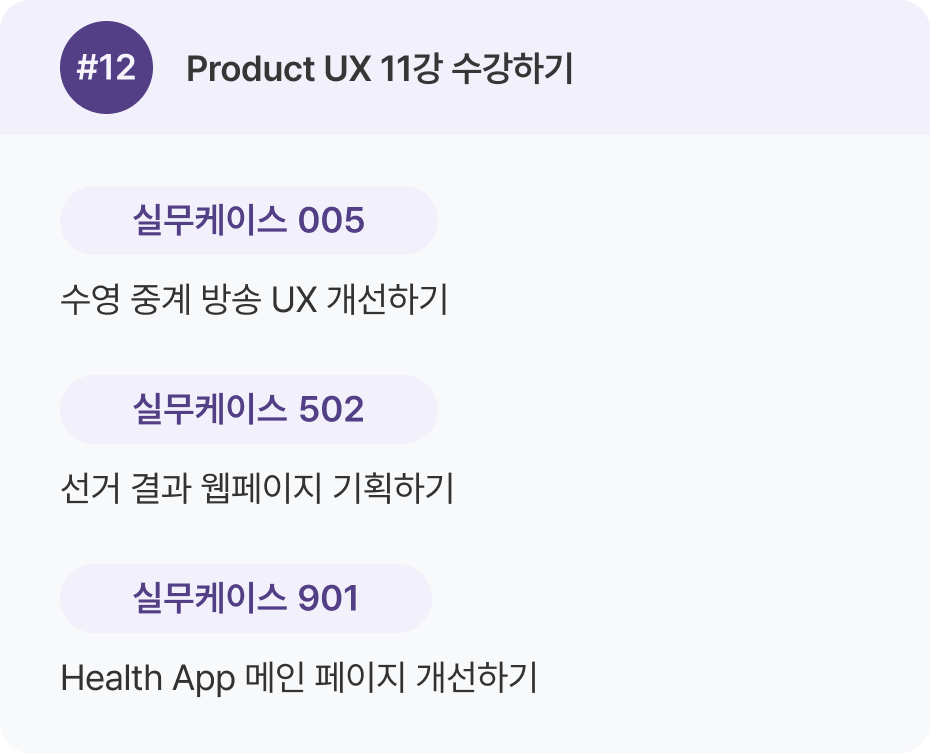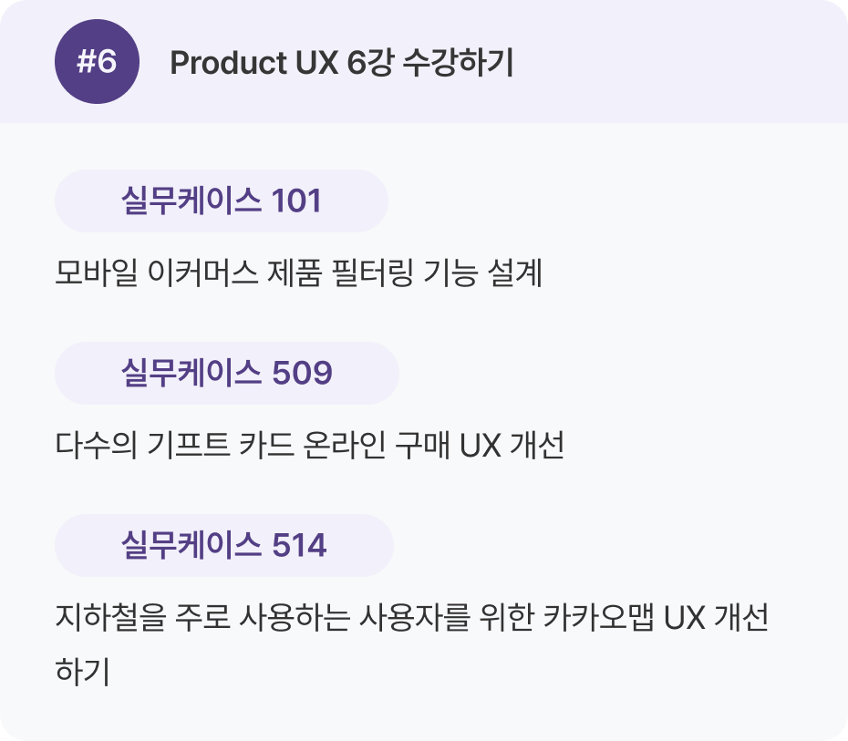 Product UX 강의 1–16강을 한 번 전체 수강한 뒤, 두 번째 학습에서 실무 케이스를 병행하는 것을 추천 드려요.
