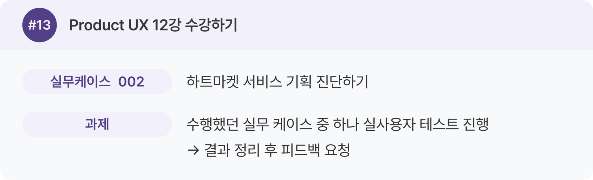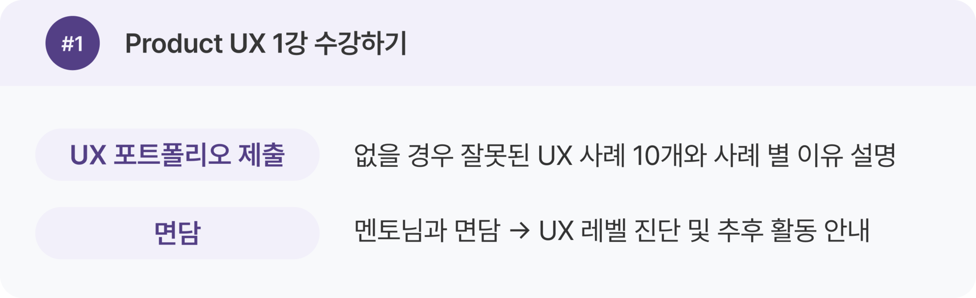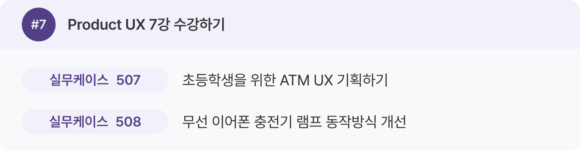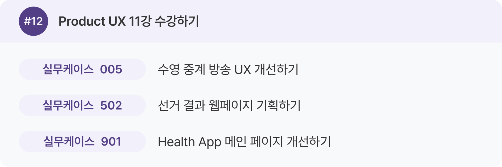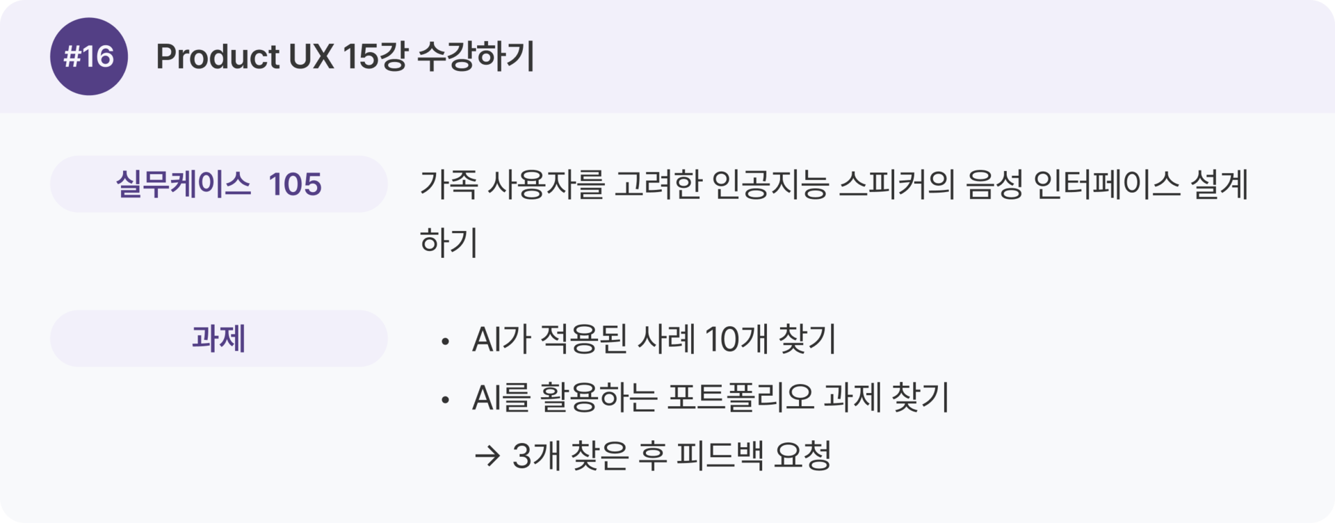Product UX 강의 1–16강을 한 번 전체 수강한 뒤, 두 번째 학습에서 실무 케이스를 병행하는 것을 추천 드려요.